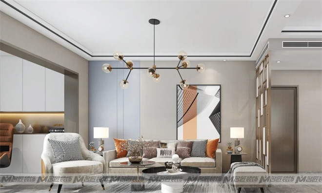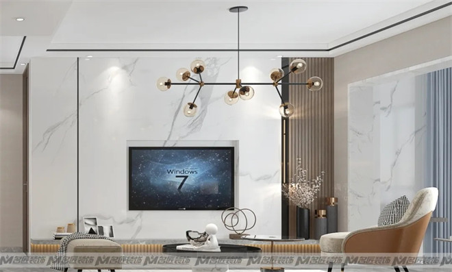 大理石電視背景墻,絲絨質(zhì)地的沙發(fā),輔以窗簾、幾何掛畫、圓形邊幾、擺件等軟裝搭配,不同材質(zhì)之間相互碰撞,又相輔相成,畫面一派和諧。
