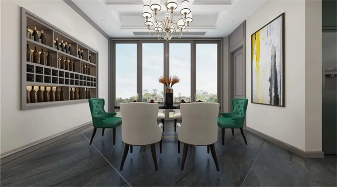餐廳布局排列有序,用金屬質(zhì)感等元素來(lái)提升空間的奢華,這里不只是生活用餐的需要,還是家人交流之地。跳躍綠色餐椅,搭配古典特色的吊燈,給空間帶來(lái)視覺(jué)上的層次感,明亮黃色裝飾畫(huà)活躍氣氛,讓用餐變成一件愉快卻又優(yōu)雅的事。