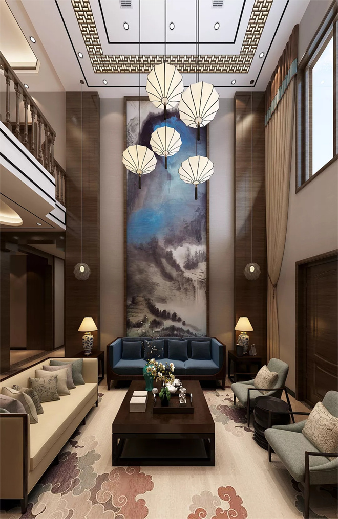 兩層樓高的客廳大氣磅礴,前后結(jié)構(gòu)對(duì)稱,不同造型的新中式燈具加上巨幅山水畫。客廳空間非常開闊,四面通透,中式的大圓桌象征了一家人和和美美