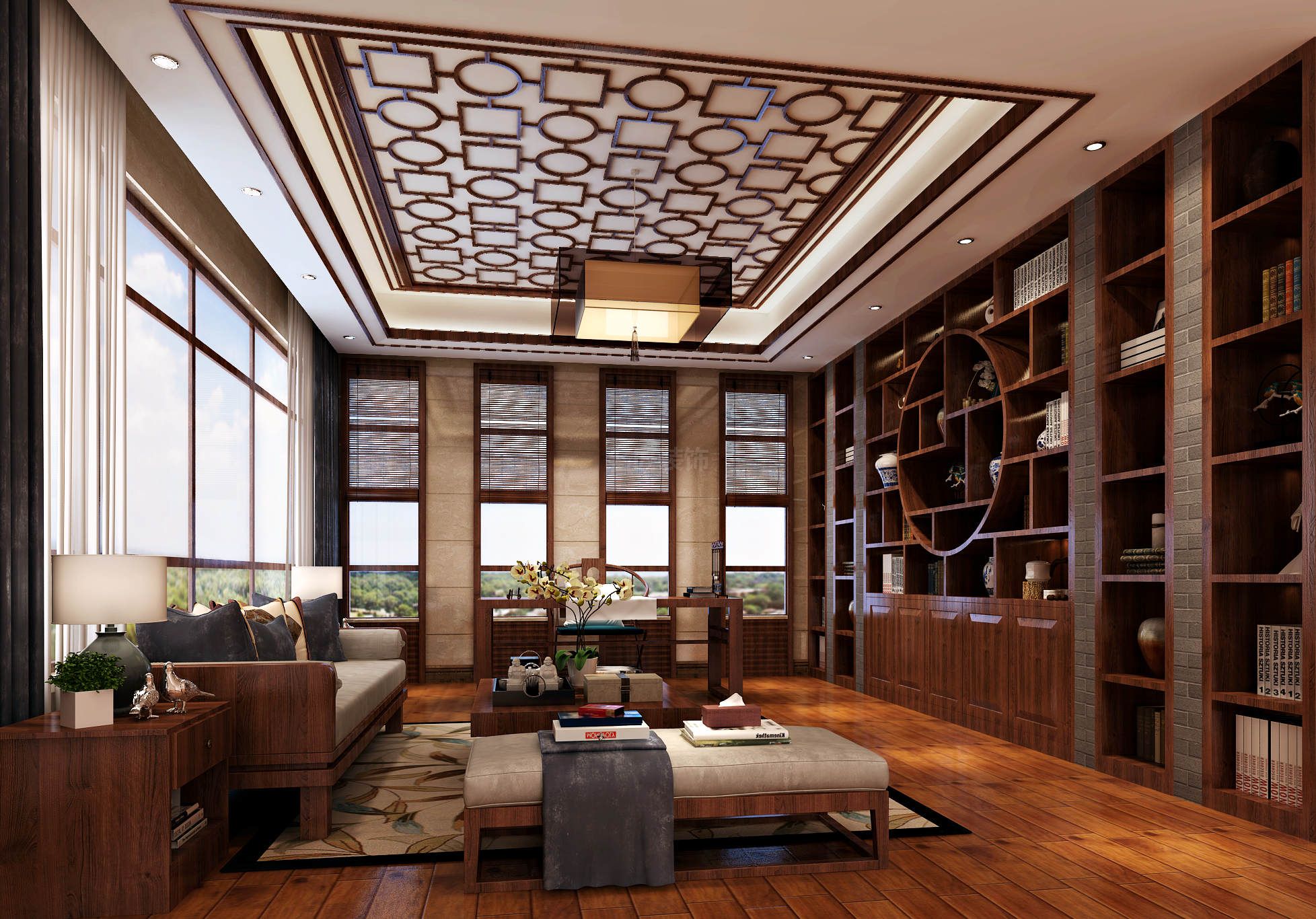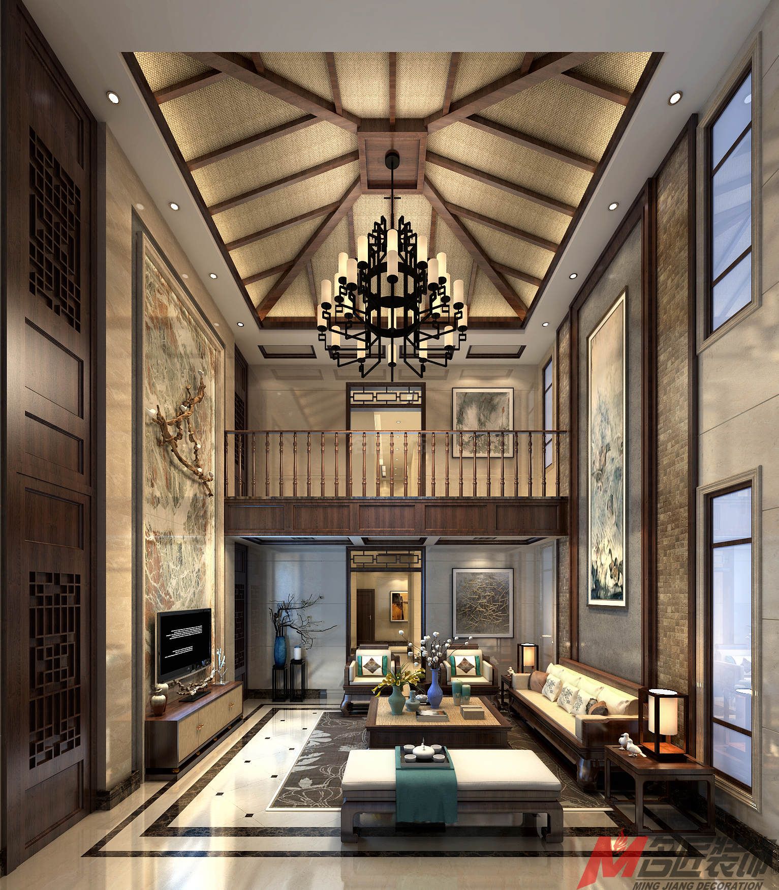 ??谛胚_海天下別墅新中式風格裝修效果圖